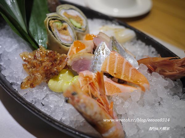 有櫻花蝦、甜蝦、生魚片、小卷、壽司捲、鮭魚卵捲、鴨賞、海帶芽..等等