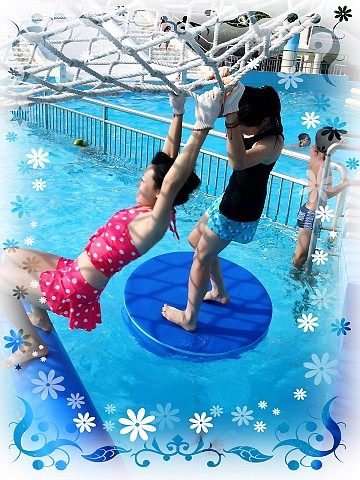 乘坐於泳圈上,靜怡比較不會怕,因為不會整個栽入水裡