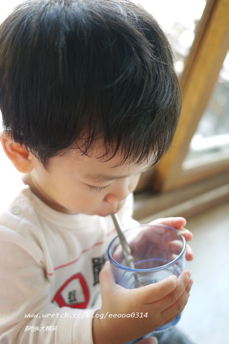 用餐的同時口渴了也會自己把嘴靠過去杯子用吸管喝開水