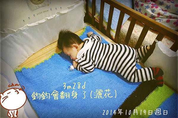 這天晚上躺在嬰兒床上的鈞鈞很努力的自己學會翻身