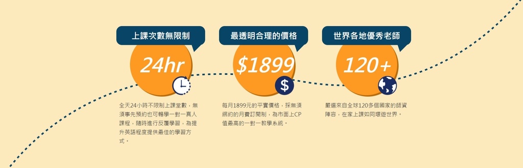 每一個特色對於線上英文都很重要,1,899元這價格真的很划算,換算下來一天只要63元就可以上好上滿,一天想要上課幾次或是上多久時間都沒有限制