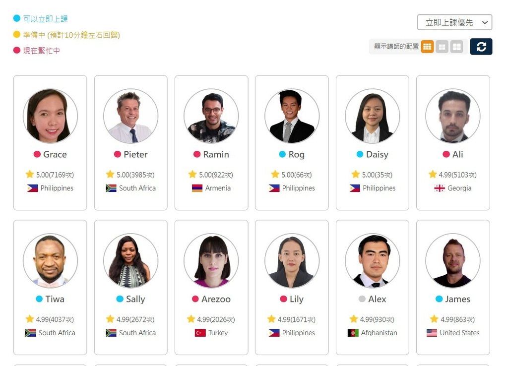 講師選擇真的很多,還可以透過燈號指示查看有時間的講師,以三種顏色燈號顯示老師狀態,藍燈:可以立即上課、黃燈:準備中 (預計10分鐘左右回歸)、紅燈:現在繁忙中