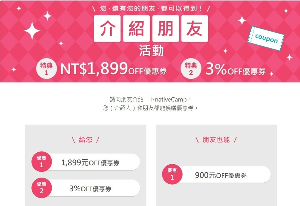 只要推薦好友加入【Native Camp. 】,好友付費成為正式會員,就可以獲取1,899TWD的優惠券,優惠券為可用於【Native Camp. 】的折價券,可用於折抵月費或金幣購買的費用,代表著可以1個月免費使用【Native Camp. 】