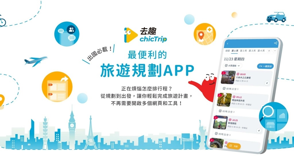 去趣chicTrip除了讓旅遊行程規劃更得心應手外,也有旅平險、租車、找航班等功能,是很實用的國內外旅遊APP,不需要開啟多個網頁和工具就能將旅遊大小事通通搞定