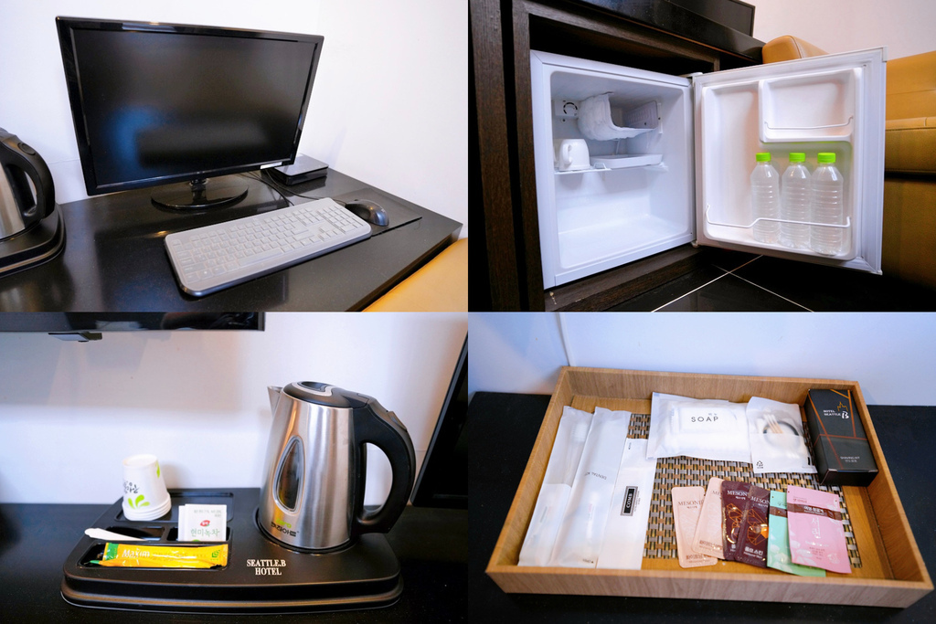 房內備品應有盡有,有茶包、咖啡包、盥洗用品、護膚品、電熱水壺以及瓶裝水等,最特別的是還有電腦,房內也有免費WIFI可以使用,很順暢。
