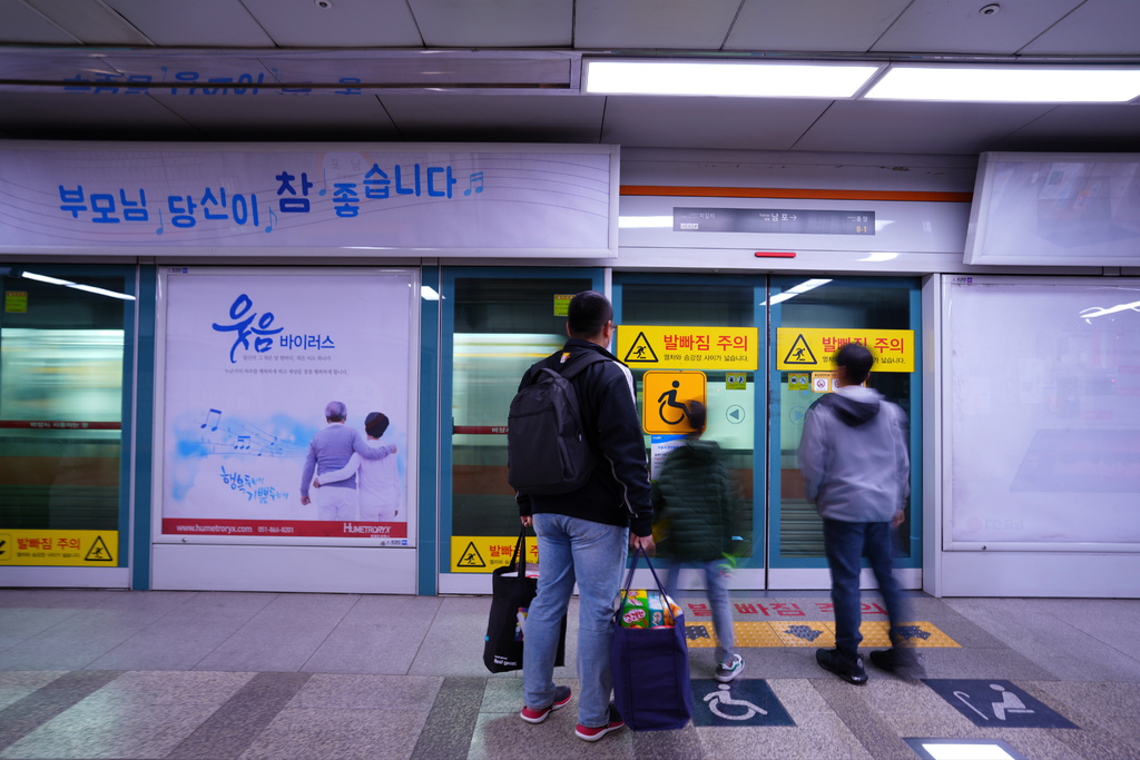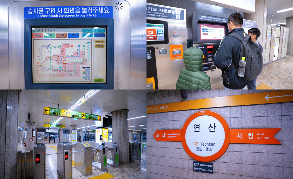 地鐵蓮山站飯店步行約5分鐘就能到,有一天晚上我們來搭地鐵去逛樂天超市。