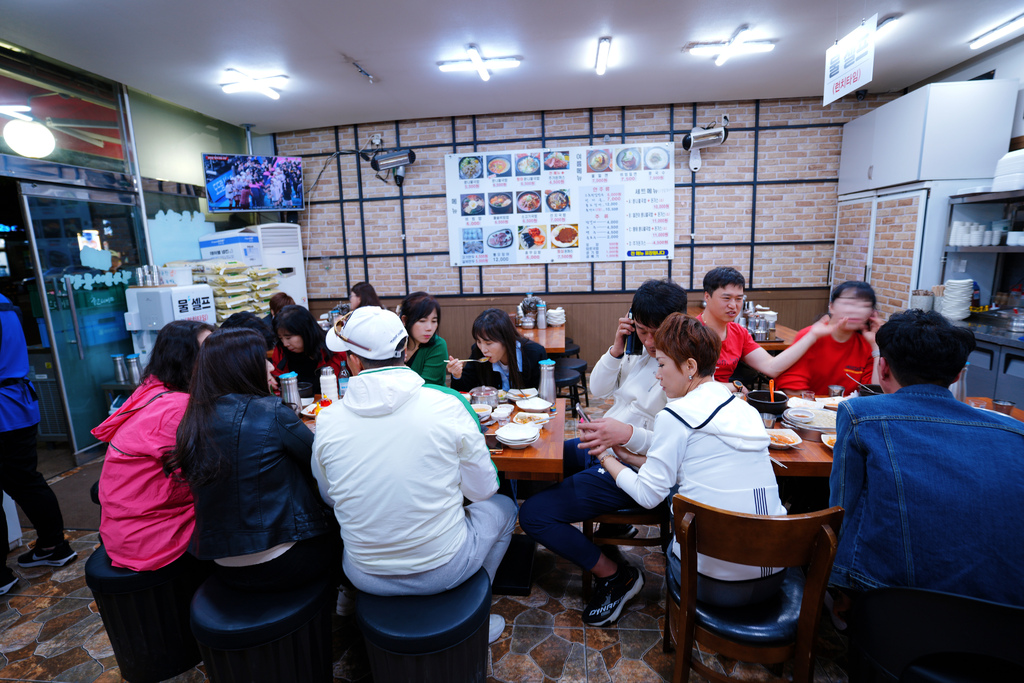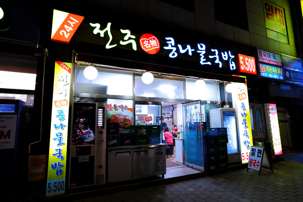 飯店走出來GU旁有一家24小時營業的全州豆芽湯飯(전주 콩나물국밥),有一天晚上逛完街後我們就來這裡吃宵夜。