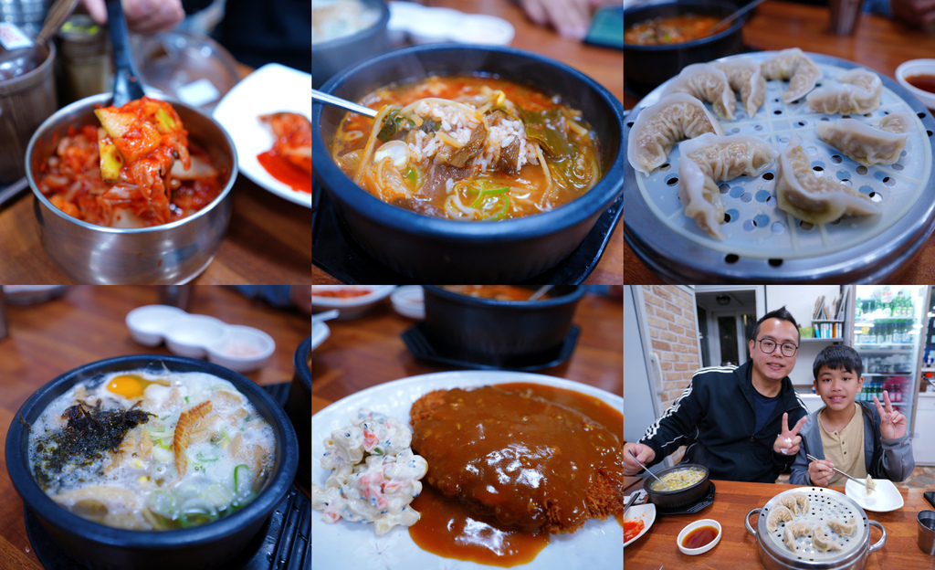 我們隨便點了幾道料理,像是黃豆芽湯飯、牛肉湯飯、餃子及炸豬排等,泡菜跟其他韓國餐廳一樣是無限供應的。