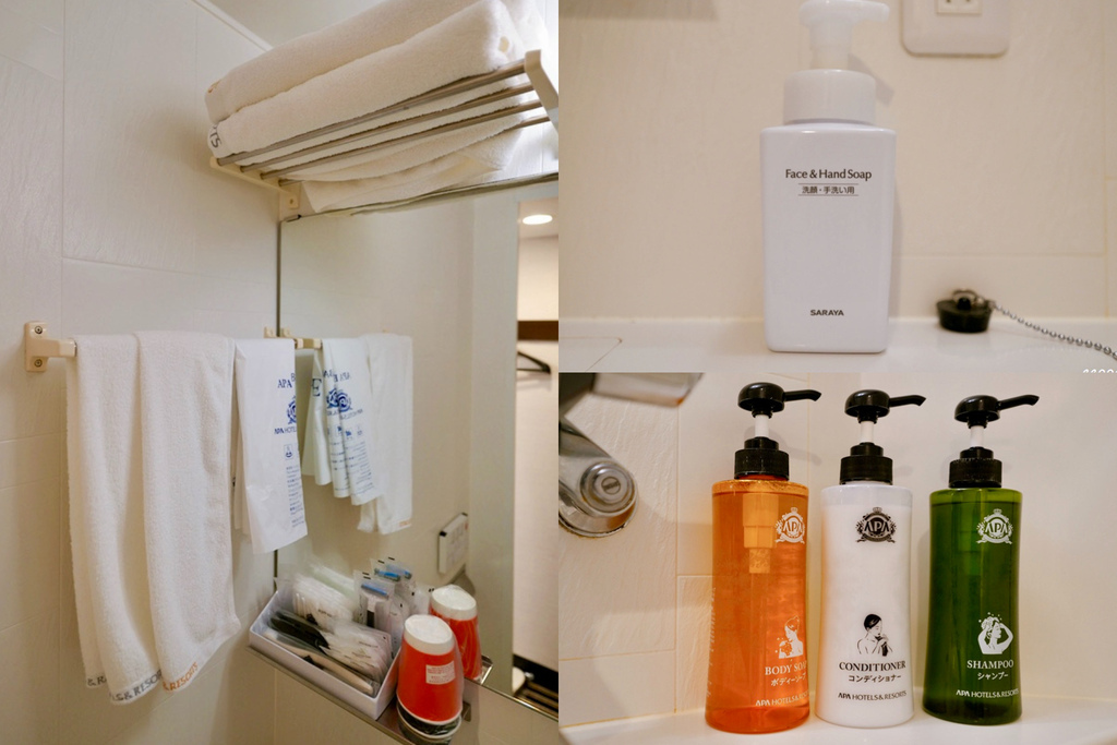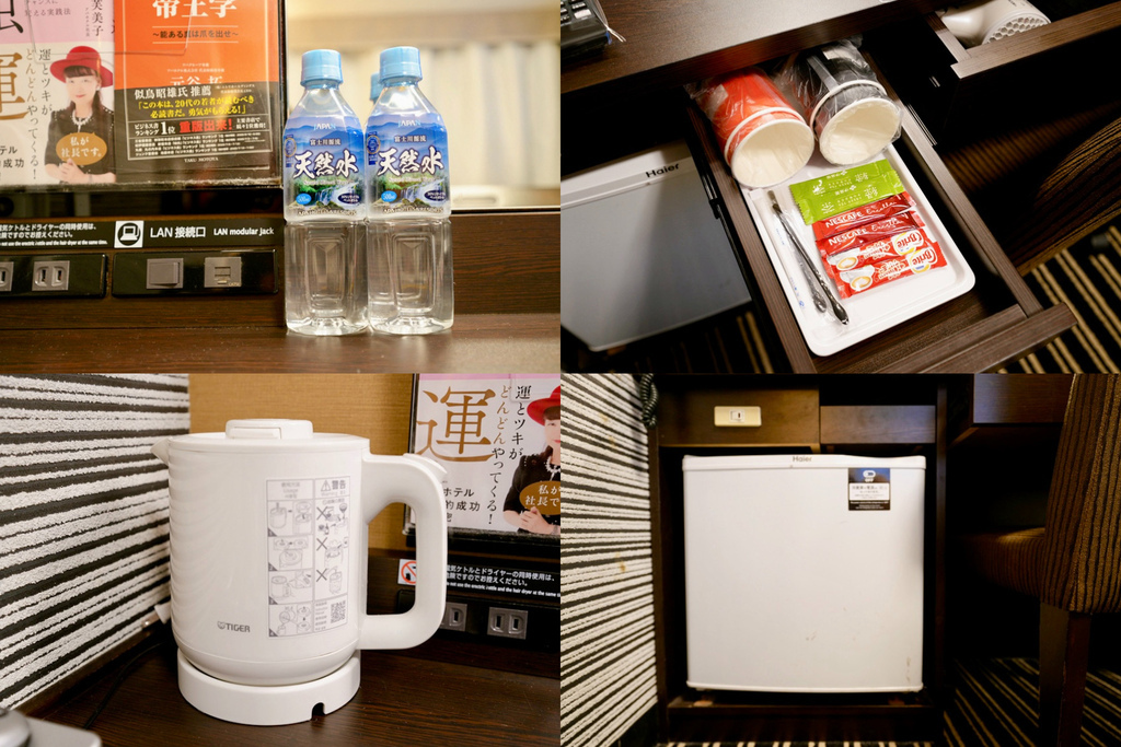 雖然日本飯店的水龍頭就能直接取水飲用但還是有附上瓶裝水,熱水壺、冰箱也都有,咖啡包及茶包在小抽屜內,還有浴衣可以穿去樓上泡澡。