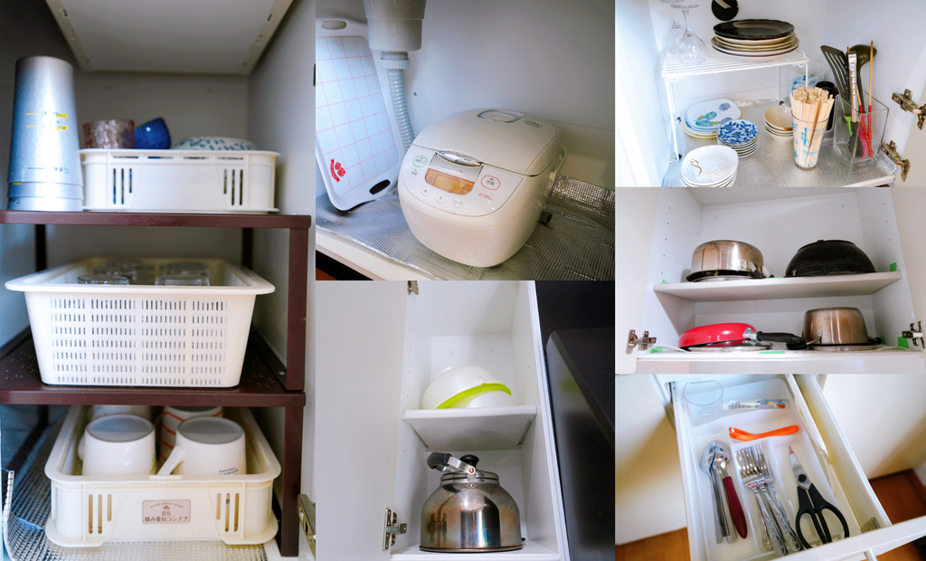 廚房是開放式的,跟客廳相通,民宿內空間雖然不大但備品設施應有盡有,日本很多飯店及民宿都會提供微波爐,加熱食物特別方便。