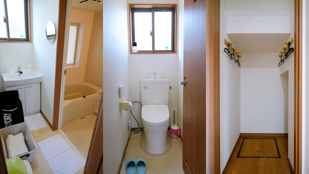 樓梯旁有三個相連的門,分別為廁所、浴室及置物掛衣間。