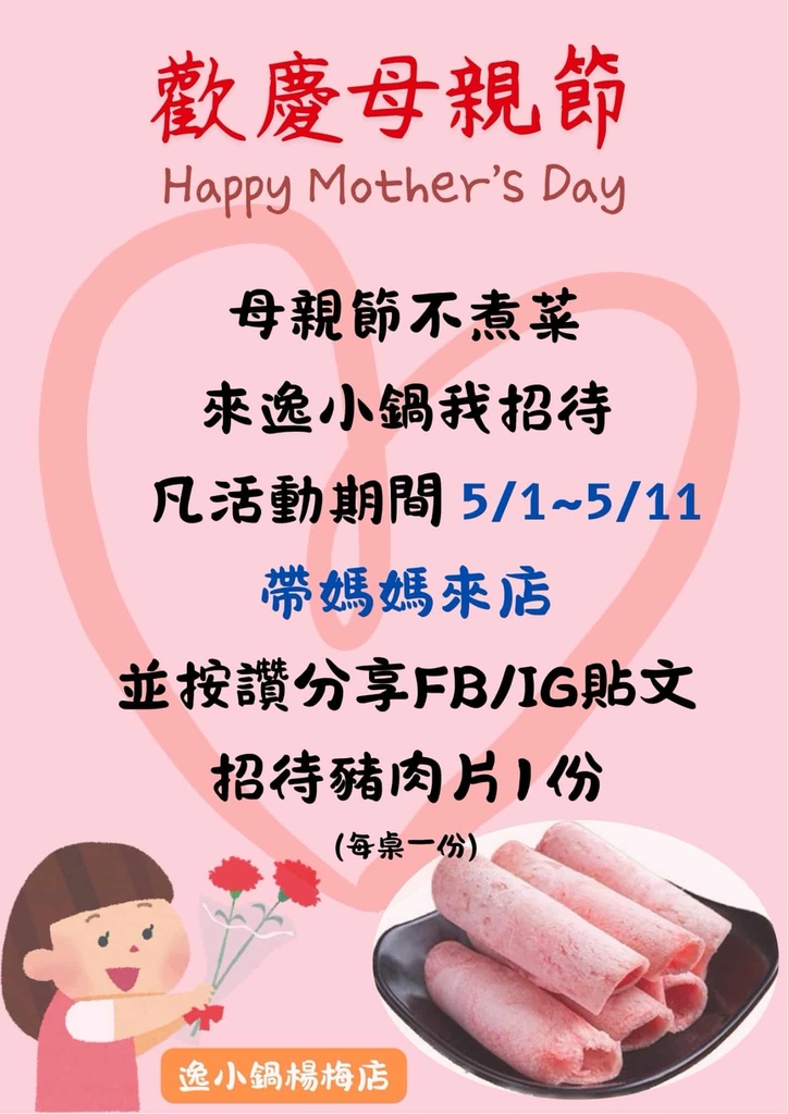 按讚粉專並分享活動貼文,送豬肉片一份(每桌限一份),不限定媽媽也能參加喔!