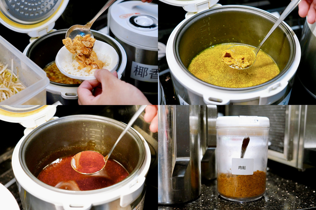 飯食不只白飯吃到飽,還提供壽喜燒醬、椰香咖哩醬、麻辣拌飯醬與肉鬆,自由搭配超過癮!