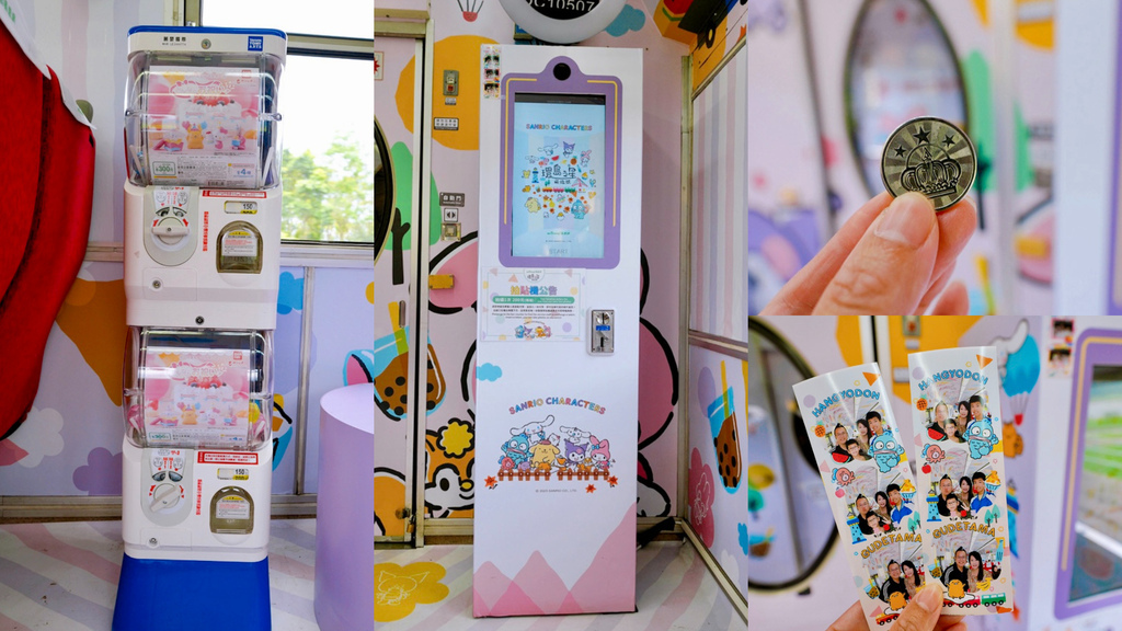 拍貼機有「美樂蒂x酷洛米」、「布丁狗x大耳狗」及「人魚漢頓x蛋黃哥」三種圖案可選擇,一次會出來兩張貼紙,需至吧檯車廂換代幣使用。
