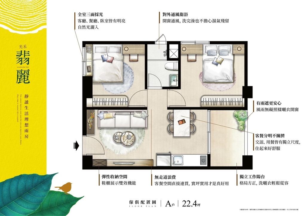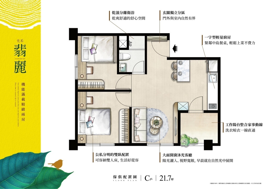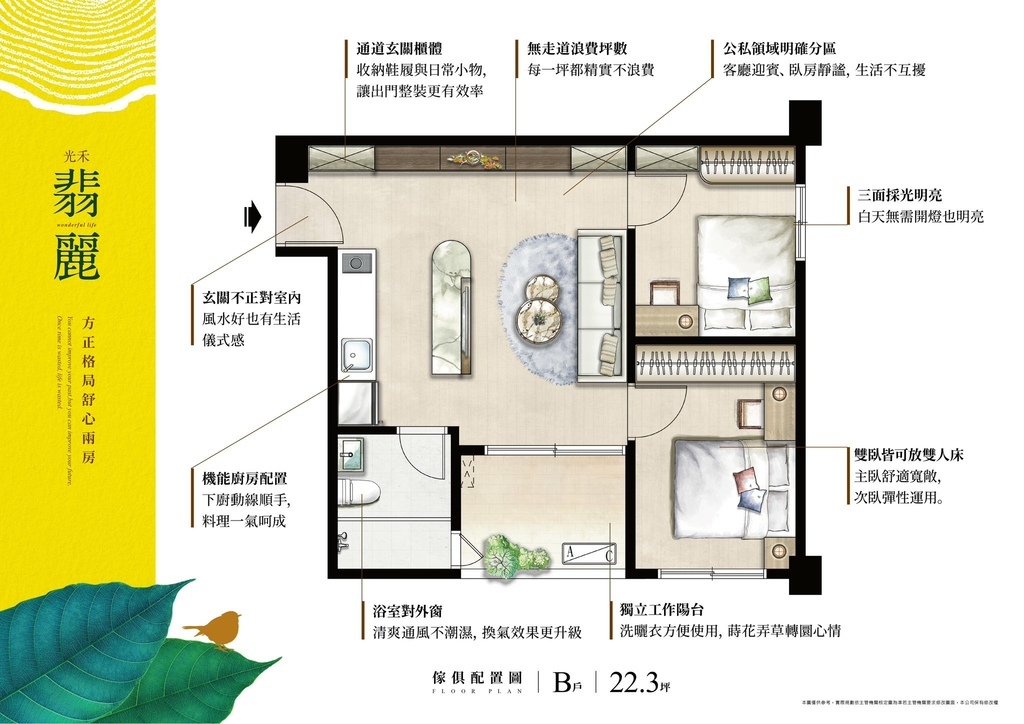住宅樓層位於2至7樓,採每層三戶配置,規劃為21至22坪的兩房格局,全戶皆擁有雙面採光,格局方正、通風採光俱佳。