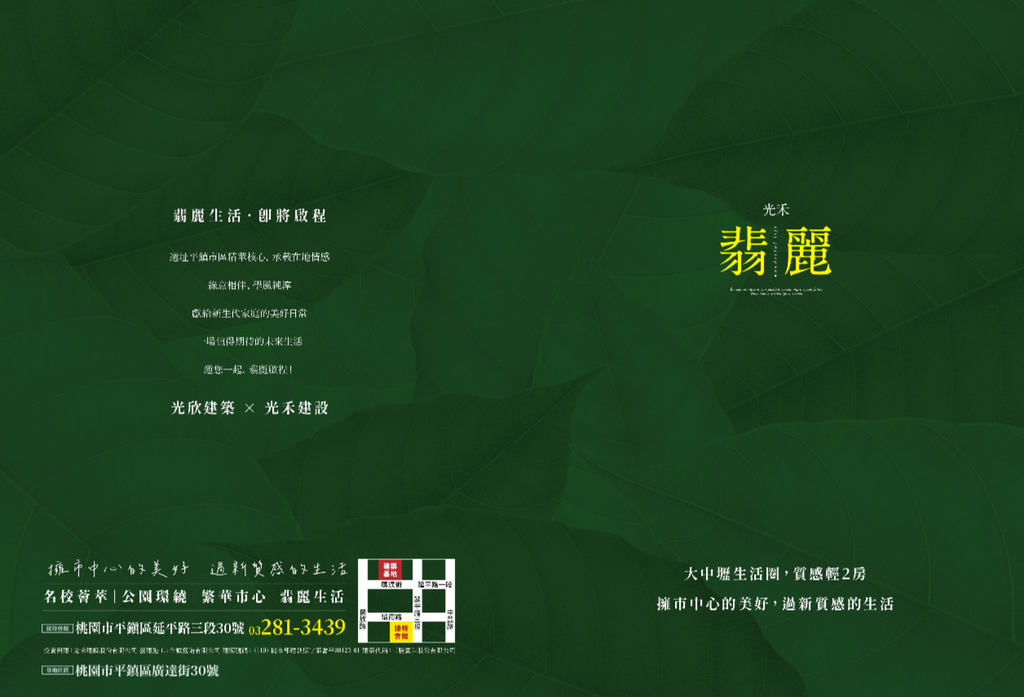 位於桃園平鎮的預售新案【光禾翡麗】,由光禾建設股份有限公司精心打造,主打「超低公設比、純兩房規劃、戶戶雙面採光、親民總價」,提供首購族與小家庭兼具質感與機能的理想生活空間。