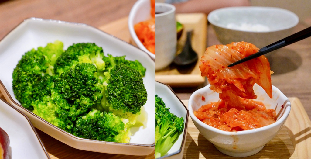 定食附白飯、味噌湯及野菜,本身就能吃得滿足。我們升級套餐搭配泡菜及花椰菜與飲料。