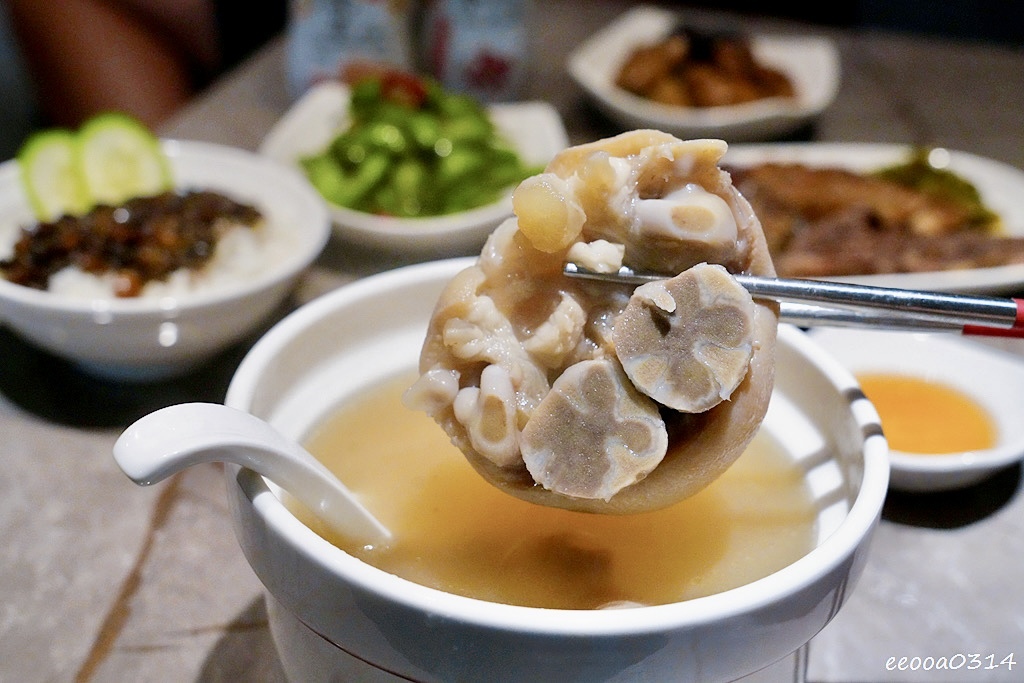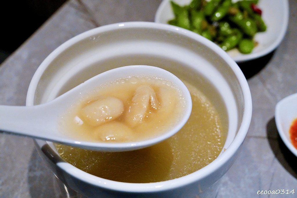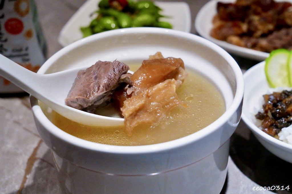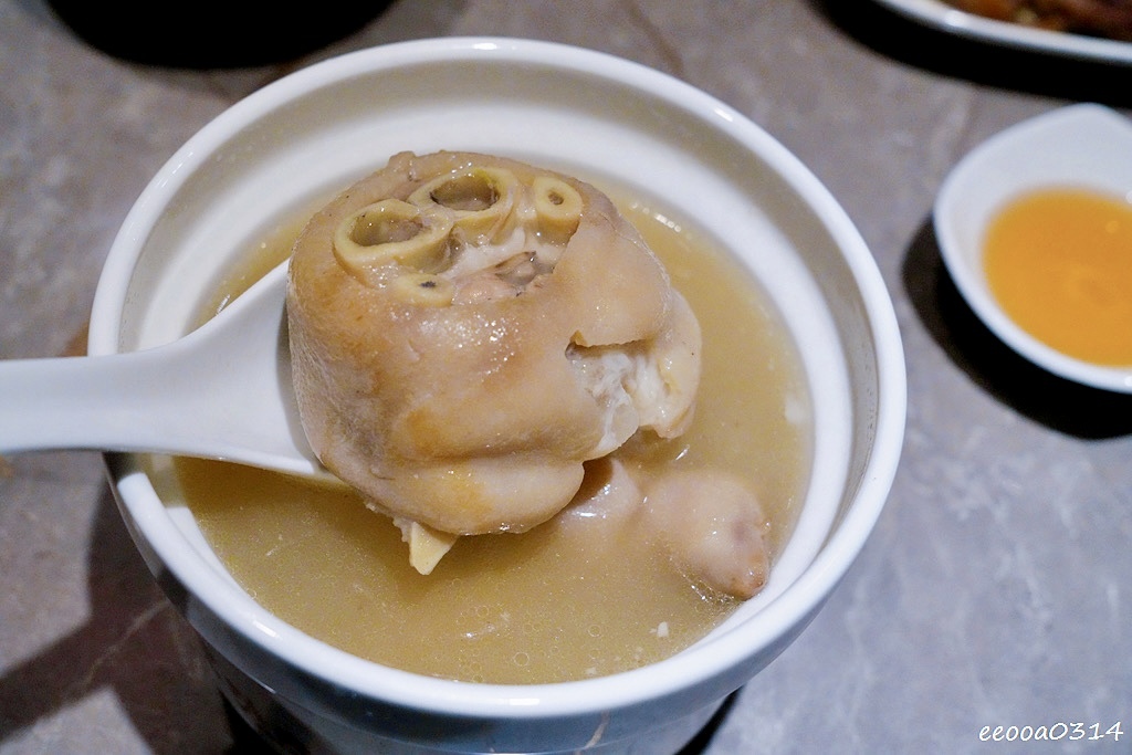 豬蹄燉至入口即化,湯頭滿是膠質感,清甜回甘。搭配雲豆與干貝細火慢燉,喝起來溫潤鮮美,附上的特製沾醬還能提鮮解膩。
