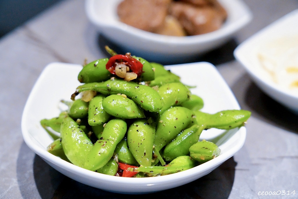 • 涼拌毛豆:帶有黑胡椒的微辣口感,鹹香涮嘴,一口接一口停不下來。