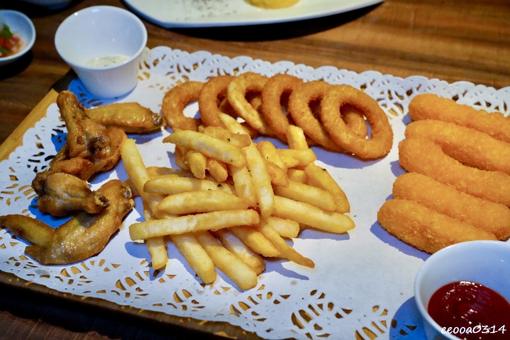 此外,我們還點了「酥炸派對」,包括香濃起司條、金黃洋蔥圈、酥脆薯條,以及多汁雞翅,每一口都充滿幸福感,特別適合聚餐或小朋友一起分享。