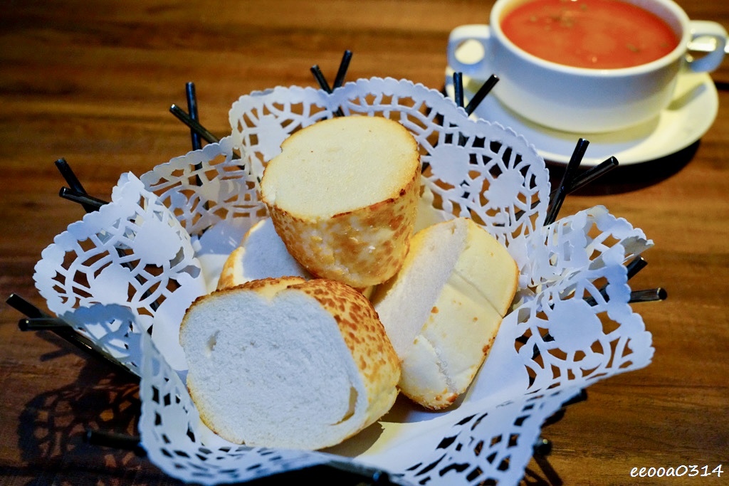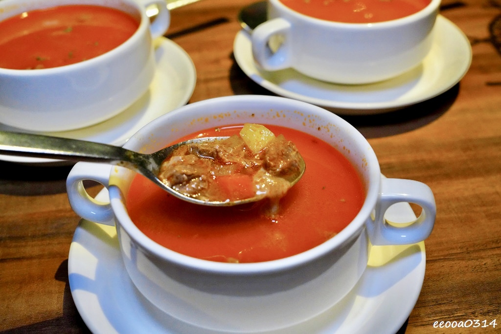 套餐的起司麵包外酥內軟,帶微微起司鹹香,單吃就美味;沾上羅宋湯更是絕配。羅宋湯以牛大骨和蔬菜慢慢熬煮,酸甜中帶濃郁牛肉香氣,還有軟嫩牛肉塊,喝起來暖心又滿足。麵包吸滿湯汁,一口咬下外酥內軟融合湯的鮮甜酸香,令人回味無窮。