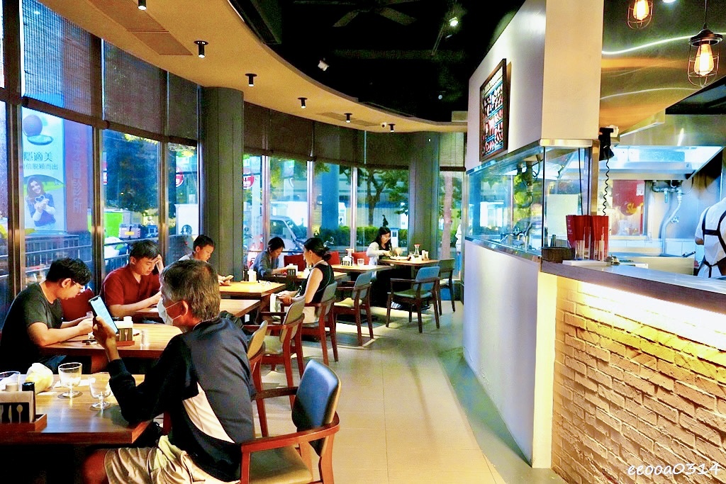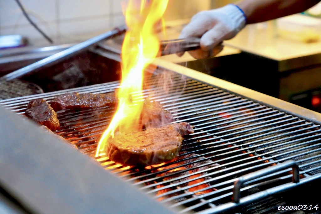 開放式廚房設計,能看到師傅專注翻烤牛排的畫面,火光躍動,讓人對餐點更期待。