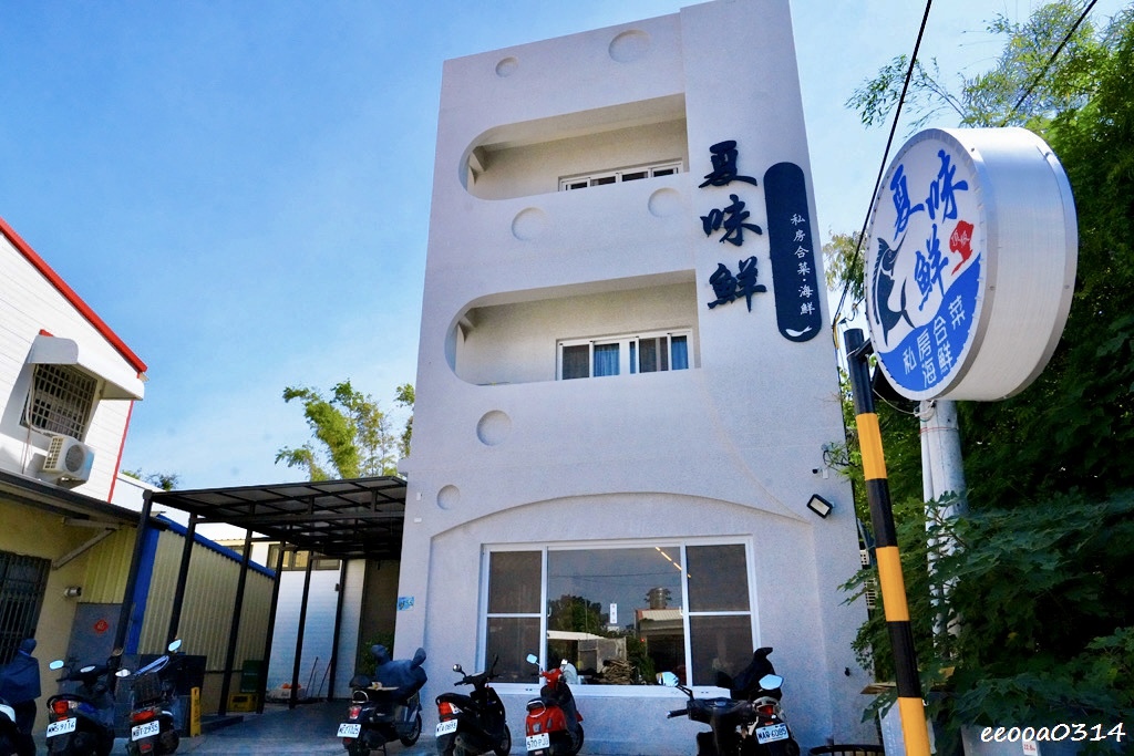 餐廳位在小琉球熱鬧的本漁路上,導航直接設定「夏味鮮」即可抵達。外觀是純白色的三層建築,簡約又帶有度假感,門口立著醒目的圓形招牌,藍色字樣遠遠就能看到。騎機車到訪的旅人,也能直接把車停在門口,非常方便。