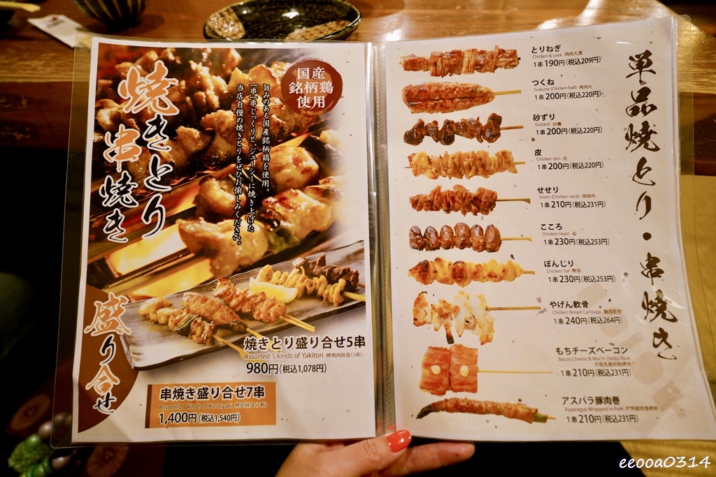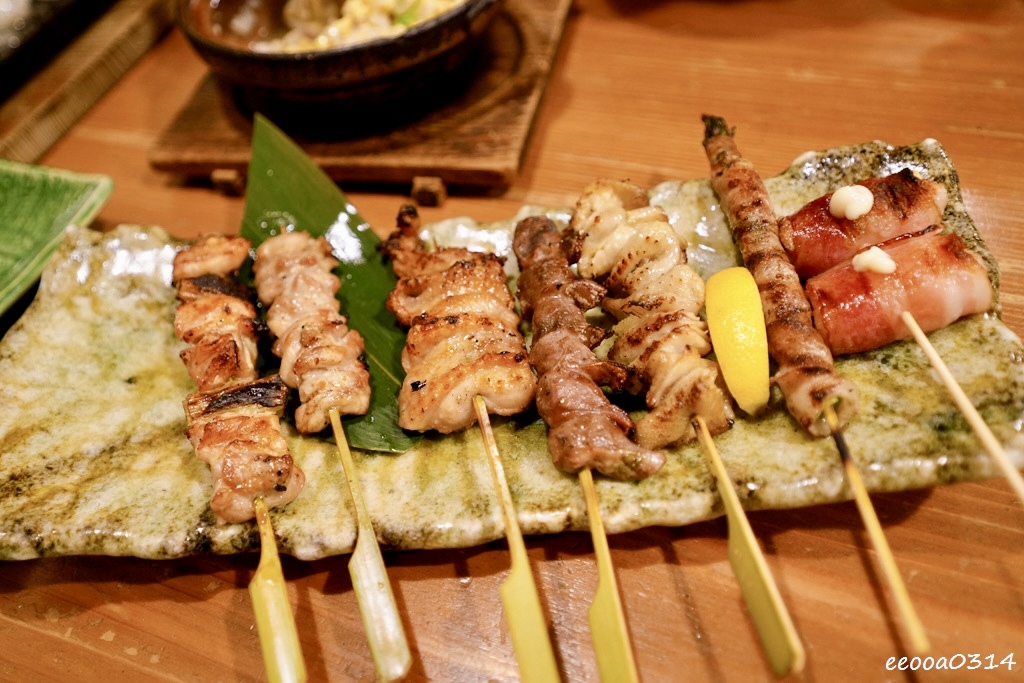 一次能吃到雞腿、雞皮、培根等多種串燒,炭火香氣撲鼻,每一串都烤得恰到好處。