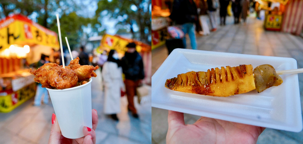 邊走邊逛的我們買了:炸雞、燒筍子及關東煮等。