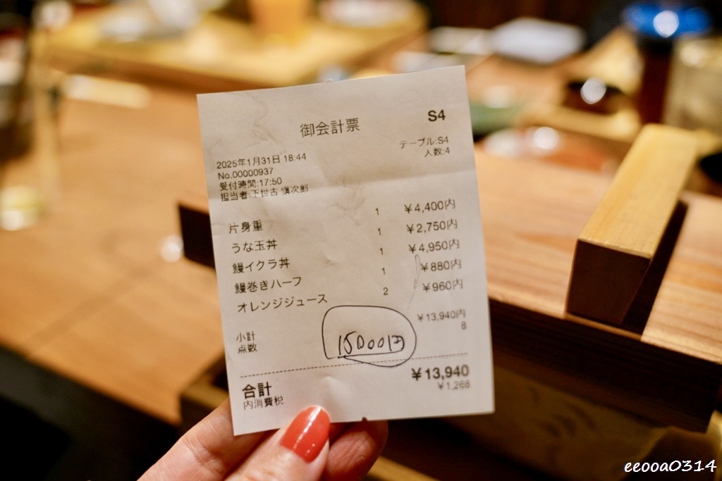 祇園的鰻魚店常常客滿,尤其熱門用餐時段建議要先訂位。這一餐我們四人合計約 ¥13,940,換算下來大約 ¥3,485/人,價格在可以接受的範圍內。